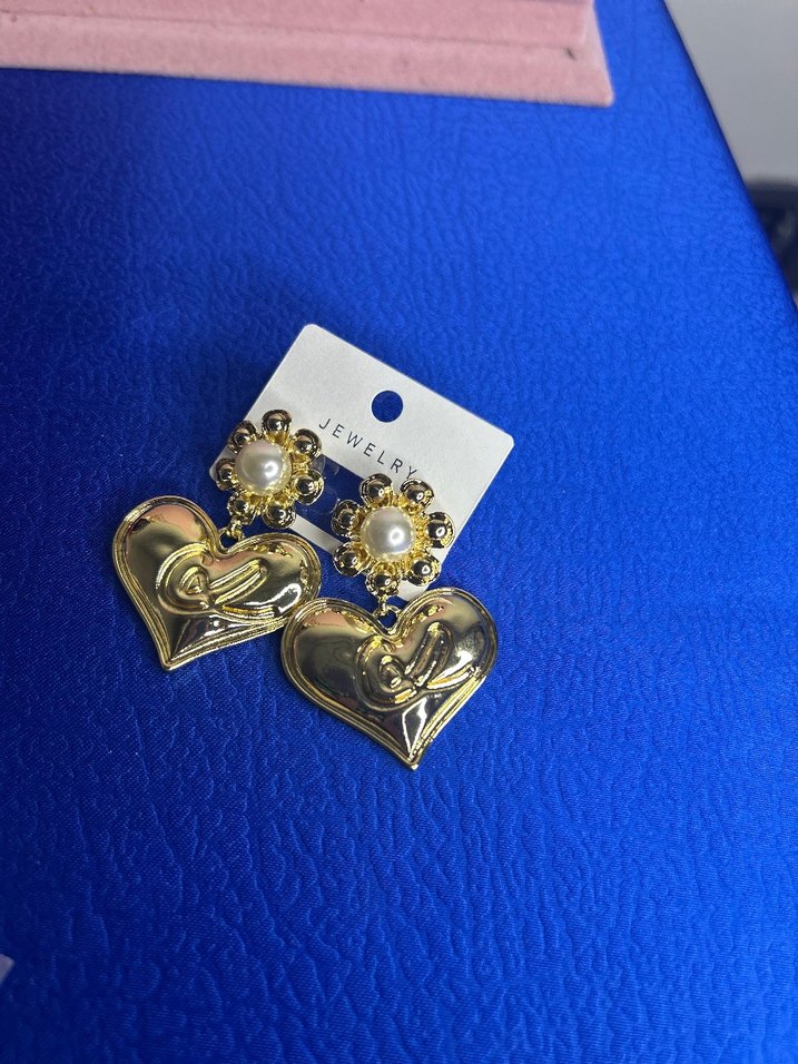 Parlak altın renkli, inci detaylı mini kalp şekilli kısa küpelerdir. Romantik gece için uygundur.