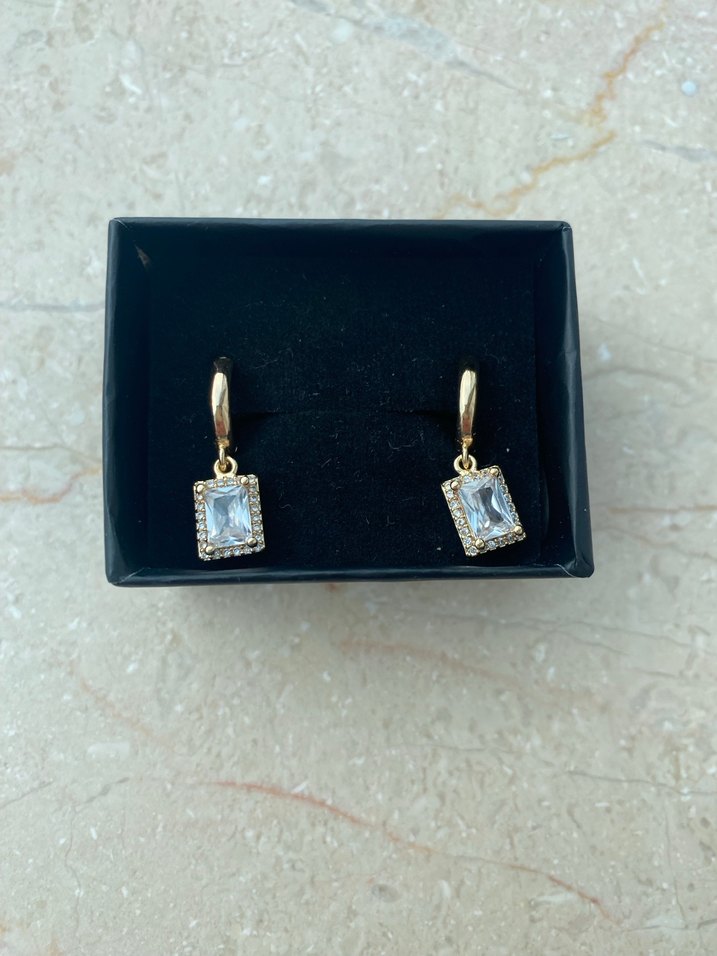 Altın renkli, mini kareli ve payetli tasarıma sahip kısa küpeler. Romantik akşamlar için modern klasik ve göz alıcı bir stil sunar. ✨temiz kullanılmadı