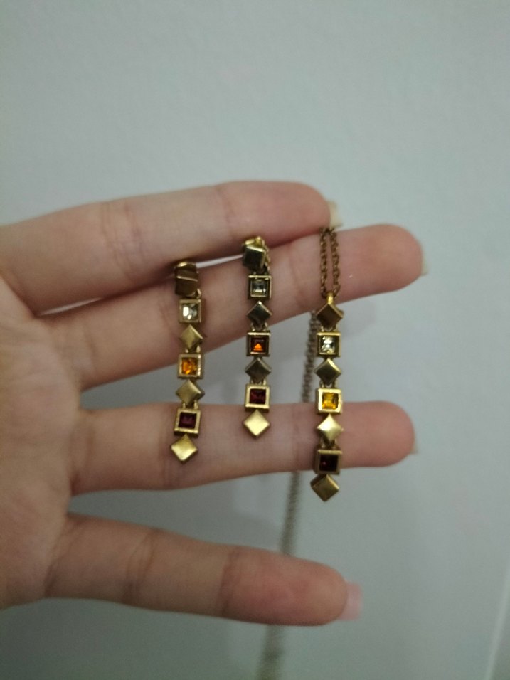 Günlük kullanıma uygun, kısa uzunlukta altın renkli zincir ve kareli detaylara sahip mini kolye ve küpe. ✨