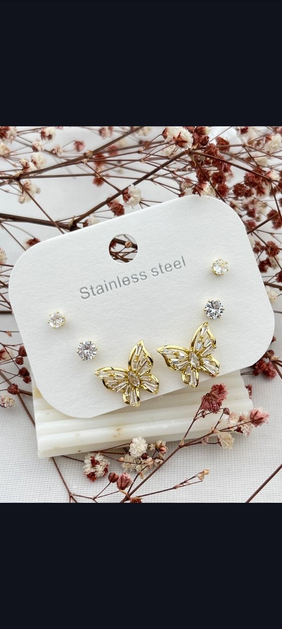 Altın renkli paslanmaz çelikten mini kelebek tasarımlı, payet detaylı küpeler. Düğün ve minimalist tarzlar için kısa uzunlukta, modern klasik görünüm.