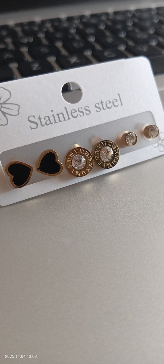 Paslanmaz çelikten yapılmış, parlak altın renkli ve payet detaylı üç çift kısa uzunlukta modern klasik küpe seti. Günlük kullanıma uygundur.