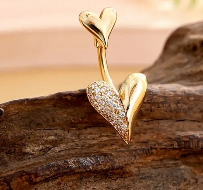 Parlak altın renkte, mini uzunlukta, çift kalp tasarımlı, pullu detaylara sahip modern piercing. Alerji ve kararma yapmaz.