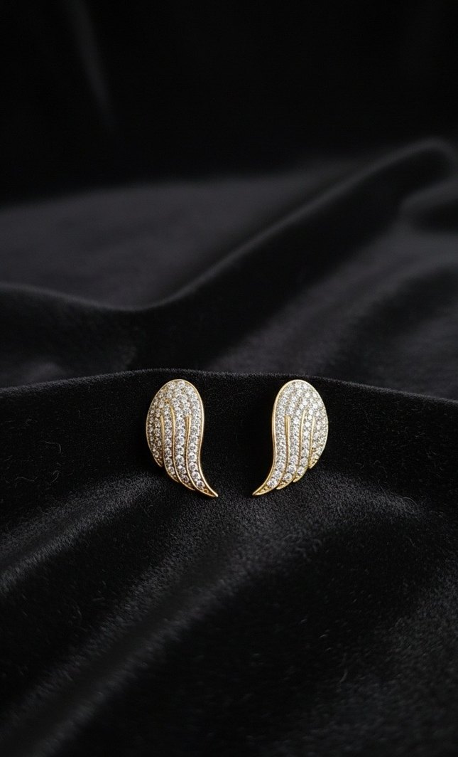 Düğünler için payet detaylı, nakış desenli altın renkli mini küpeler. Parlak yüzeyiyle modern klasik tarz sunar.