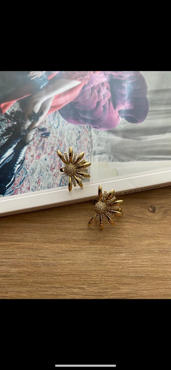 Parlak altın renkli, pullu detaylı ve mini ayçiçeği tasarımlı vintage bohem küpelerdir, günlük kullanıma uygundur.