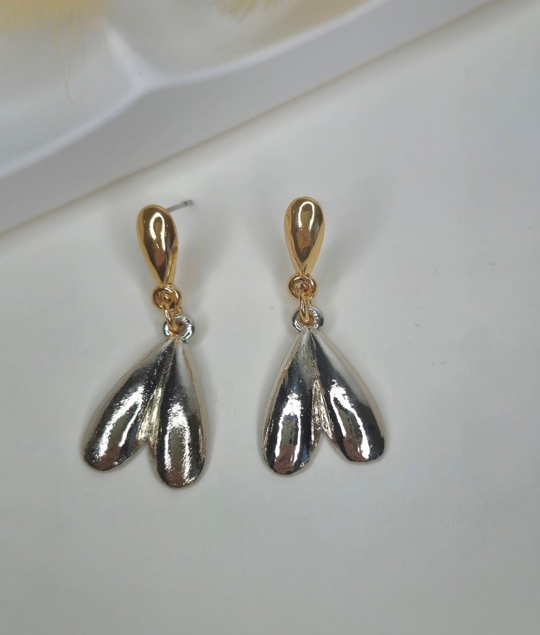 Parlak altın renkli üst kısmı ve gümüş renkli püskülleriyle kısa uzunlukta, çağdaş tarzda romantik akşamlar için uygun küpeler.