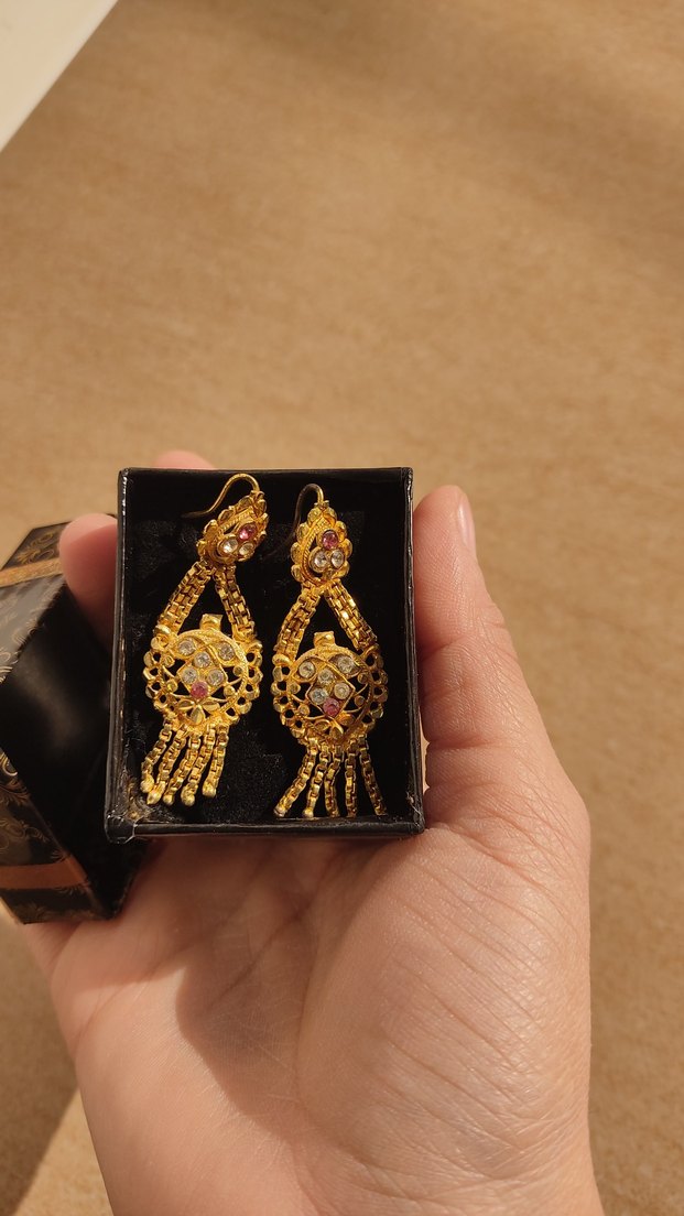 Altın renginde, desenli ve mini püsküllü vintage tarzda kısa uzunlukta küpeler. Düğün ve klasik zarafet için uygun. sadece birinde biraz kararması var görsele ekledim