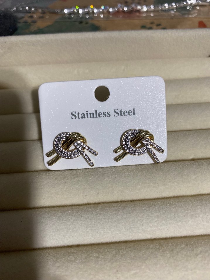 Paslanmaz çelikten yapılmış, altın renkli mini uzunlukta, sıralı taşlı düğüm desenli kadın küpeleri. Minimalist sokak stili için uygun, günlük kullanıma uygun. ✨