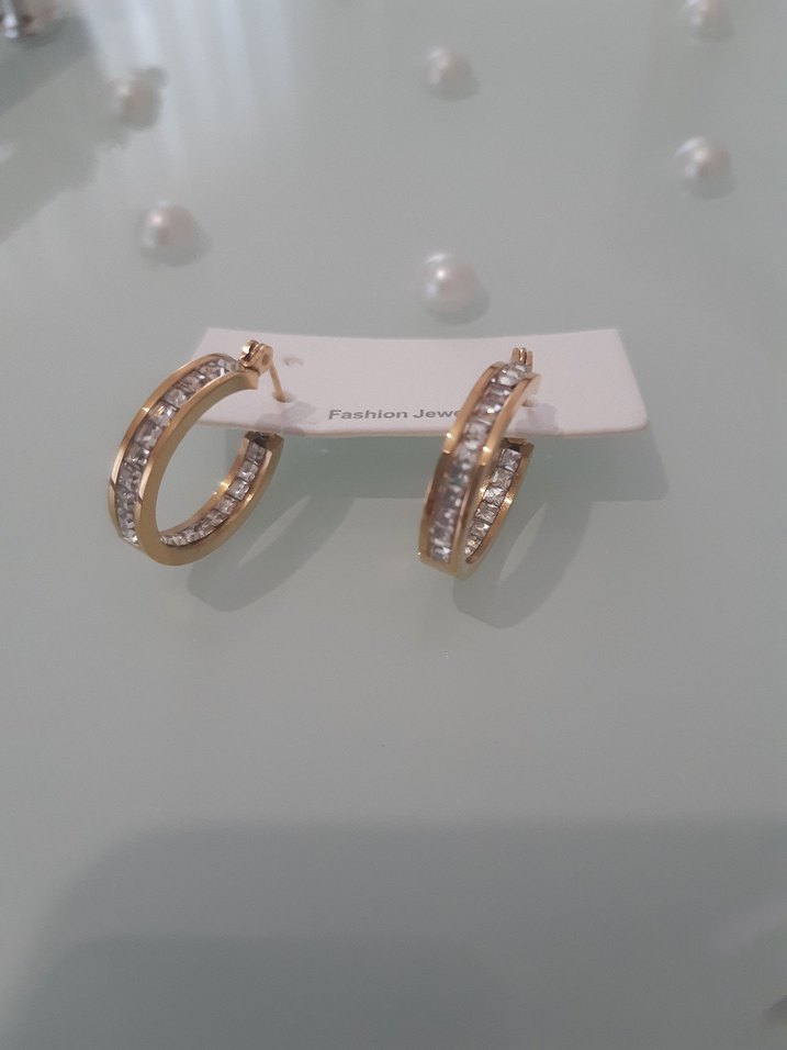 Altın renkli, taşlı mini halka küpeler, klasik şıklık ve düğünler için uygun. Kısa boylu ve minimalist tarzda.