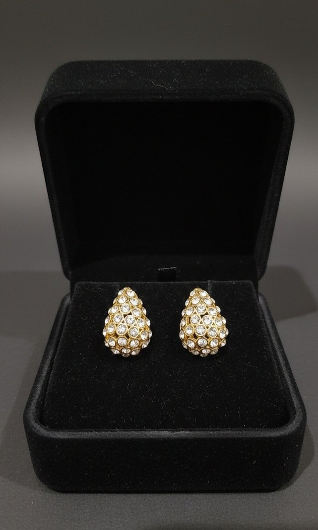 Altın renkli, mini boyda, taşlı ve parlak yüzeye sahip çağdaş tarzda küpeler. Düğün ve özel günler için uygun.