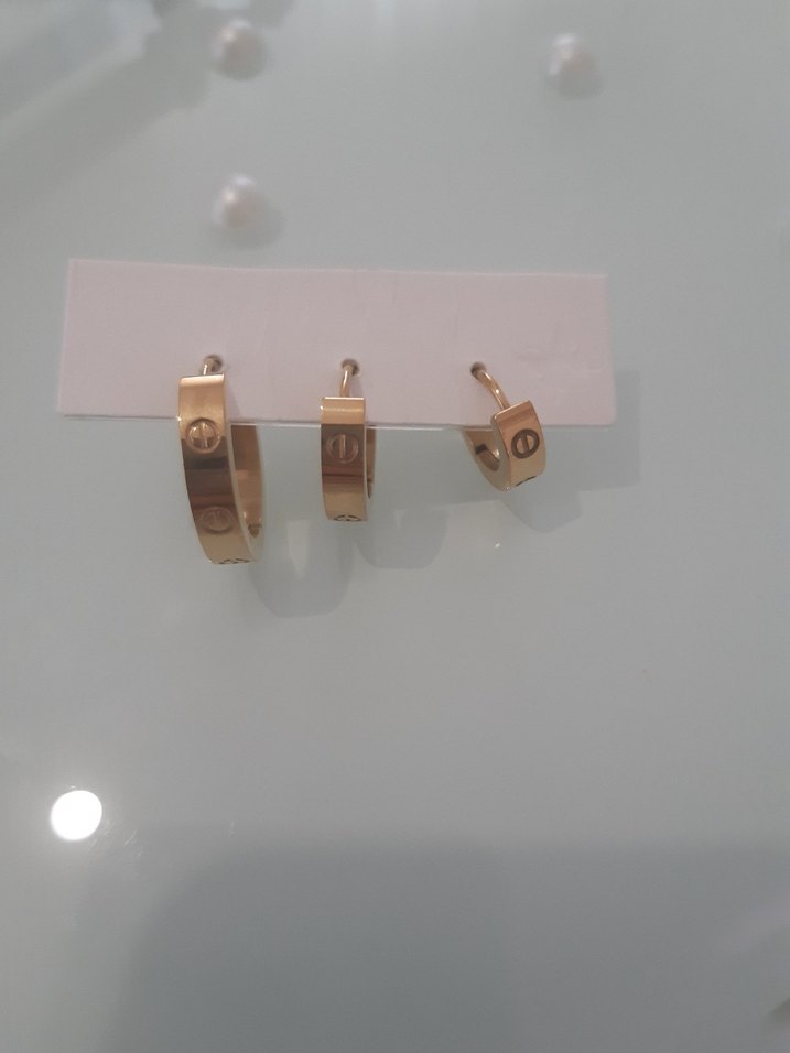 Altın renkli mini halka küpeler, tokalı ve baskılı desene sahip. Günlük sokak stiline uygun, minimalist tasarım. ✨