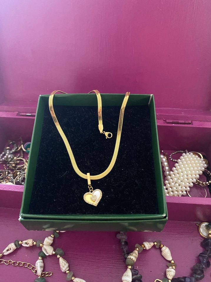 Parlak altın renkli, kısa yılan desenli zincir ve kalp kolye ucu, romantik akşamlar için klasik Parisli bohem tarzı.