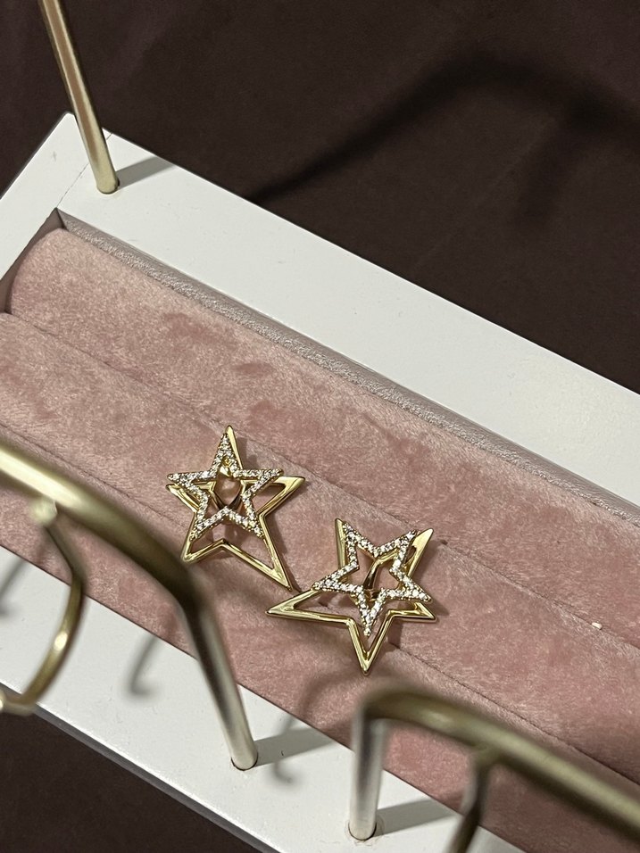 Altın renkli mini yıldız şeklinde, işlemeli ve payetli küpeler. Romantik buluşmalar için klasik ve çağdaş tarzı birleştirir. ✨