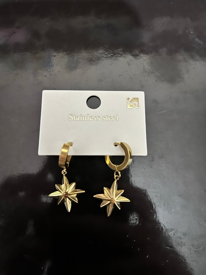 Paslanmaz çelikten yapılmış, altın renkli mini halka küpeler. Parlak boncuklu yıldız figürlü, günlük sokak stiline uygun.