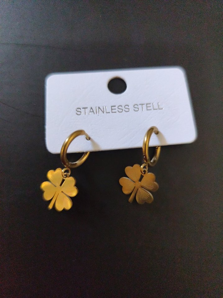 Paslanmaz çelikten yapılmış, parlak altın renkli mini halka küpeler, dört yapraklı yonca figürü ile günlük kullanıma uygun minimal tarzda.