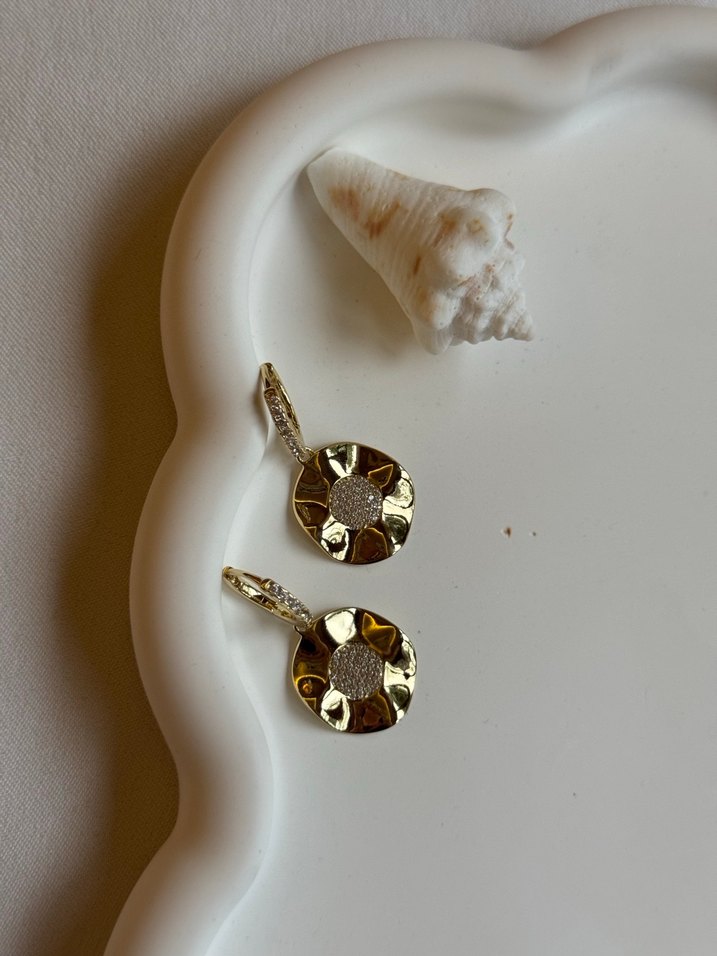 Altın renkli, yuvarlak desenli ve payet detaylı kısa uzunlukta küpeler. Minimalist ve bohem tarzı bir araya getirir, klasik zarafet sunar. ✨