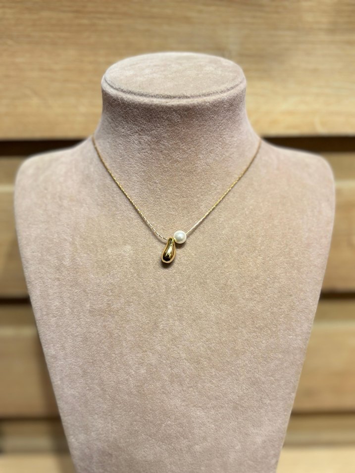 Altın renginde, ince zincir ve küçük damla formunda kolye ucu ile inci detayı bulunan minimalist ve çağdaş tarzda kısa kolye.