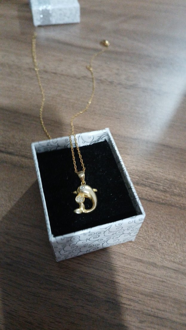 Zincir detaylı, altın renkli kısa kolye, küçük yunus figürlü. Parlak yüzeyiyle minimalist ve sade stil için uygun.