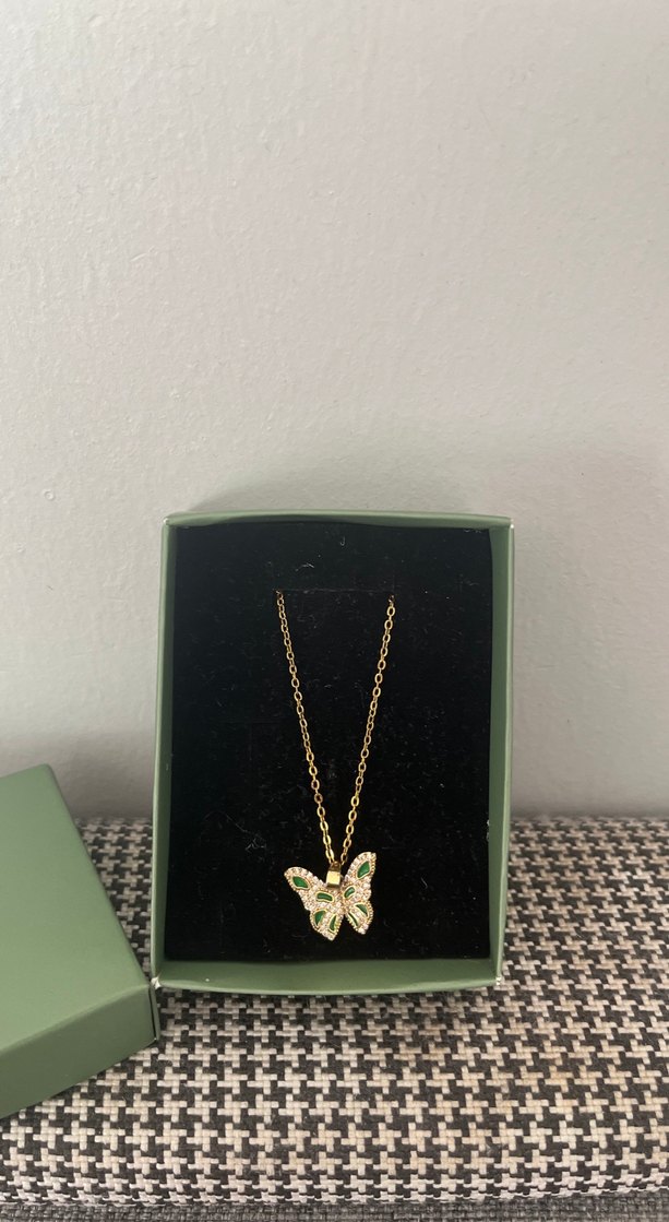 Altın renkli kısa zincirli kolye, baskılı kelebek ucu ile sade bohem tarzda günlük kullanıma uygun.