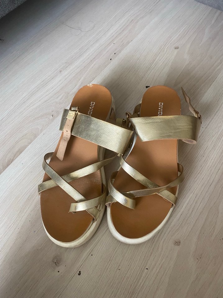 Parlak altın renkli, dolgu topuklu ve tokalı bantlara sahip kadın sandaletleri. Minimalist ve desen içermeyen kauçuk malzeme kullanılmıştır. 38 numara ama 37 bucuklara daha rahat olur sıkıntısı yok yeni gbi