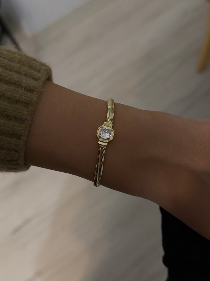 Altın renkli, yılan deseni detaylı ve tokalı minimalist bileklik, günlük kullanım ve trend sokak stiline uygundur.