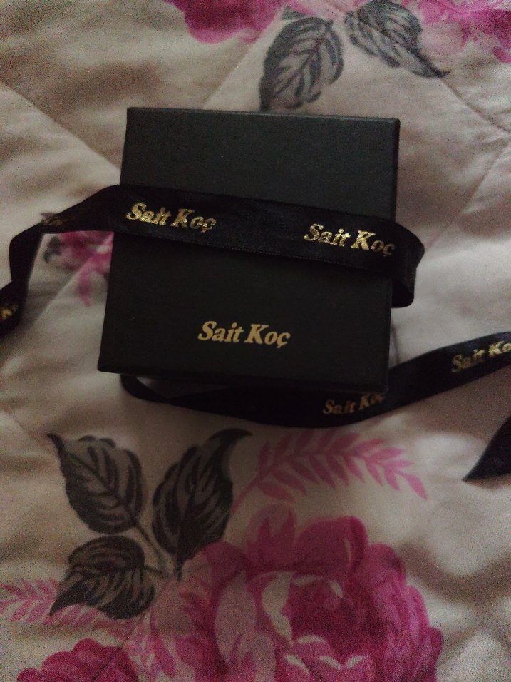 Romantik gece için koyu goth tarzda, Sait Koç yazılı baskılı kurdelenin eşlik ettiği altın renkli minimalist kadın kol düğmesi.