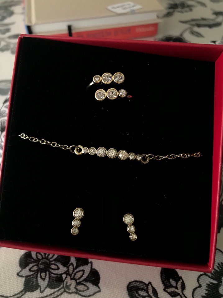 Minimalist tasarımlı, altın renkli ve simli detaylara sahip bu çağdaş kadın takı seti; küpe, bileklik ve yüzükten oluşur. Küpe, bileklik ve yüzüğü içinde kutusuyla gönderilecektir.