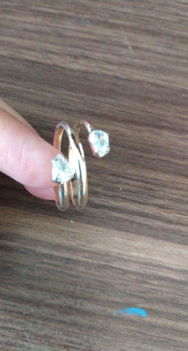 Parlak altın renkli, minimal ve bohem tarzda kadın yüzüğü. İki taşlı, payet detaylı ve düğün için uygun.