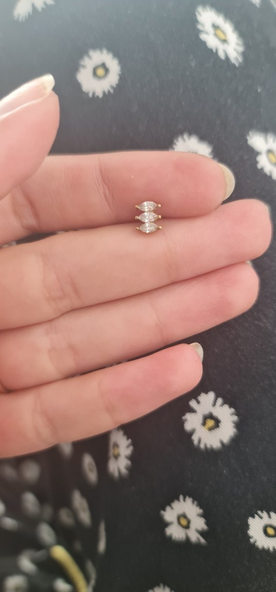 Altın renginde, sıralı üç taşlı minimalist kadın piercing, sade ve bohem tarz için uygun. ✨