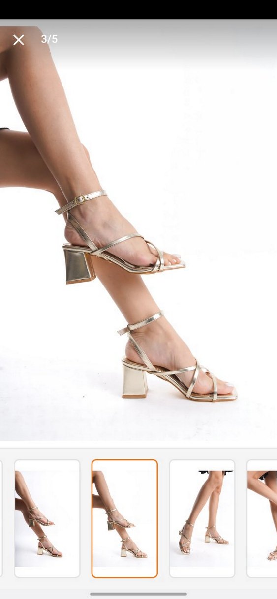 Altın parlak renkli, blok topuklu kadın gece ayakkabısı, minimal yılan deseni ve tokalı bantlarla, kauçuk malzemeden yapılmıştır. Romantik akşamlar için uygundur. ✨