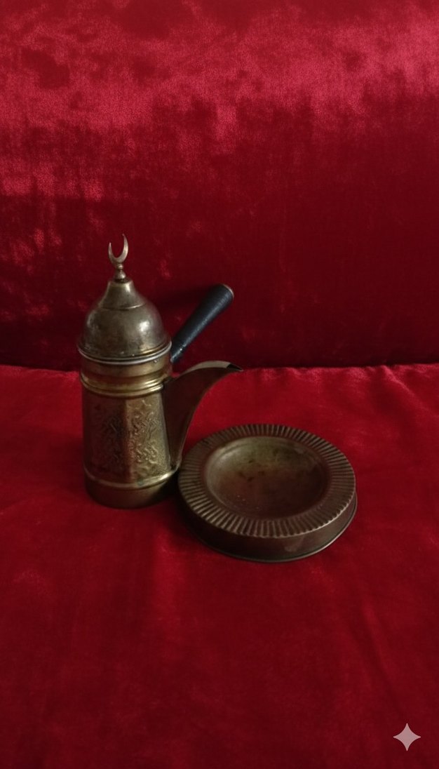 koyu altın renginde mırra cezvesi ve altlığı, altlığı isterseniz cezvenin altlığı isterseniz küllük olarak kullanabilirsiniz.