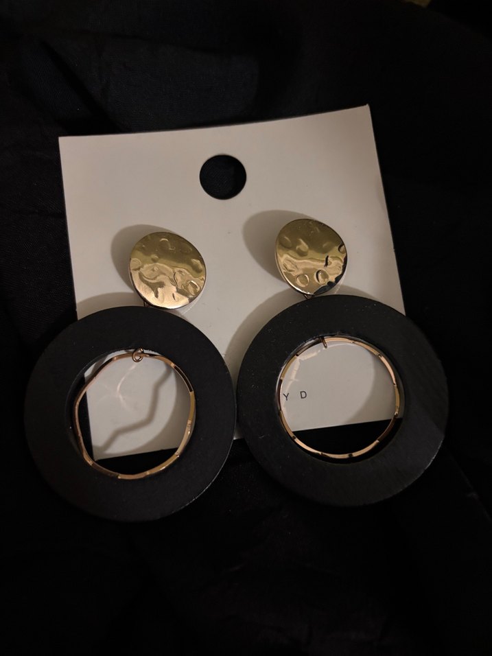 Altın renkli kemerli mini küpeler, koyu baskılı dairesel detaylarla modern ve minimalist tarzı bir araya getirir. Romantik akşamlar için uygundur.