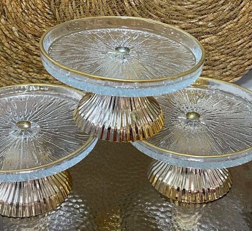 Altın renkli, parlak yüzeyli ve işleme desenli modern klasik ayaklı tabaklar. ️