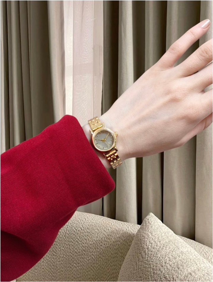 Parlak altın renkli, düğmeli tokalı kadın kol saati, modern klasik tarzı ve klasik zarafeti yansıtıyor. ⌚