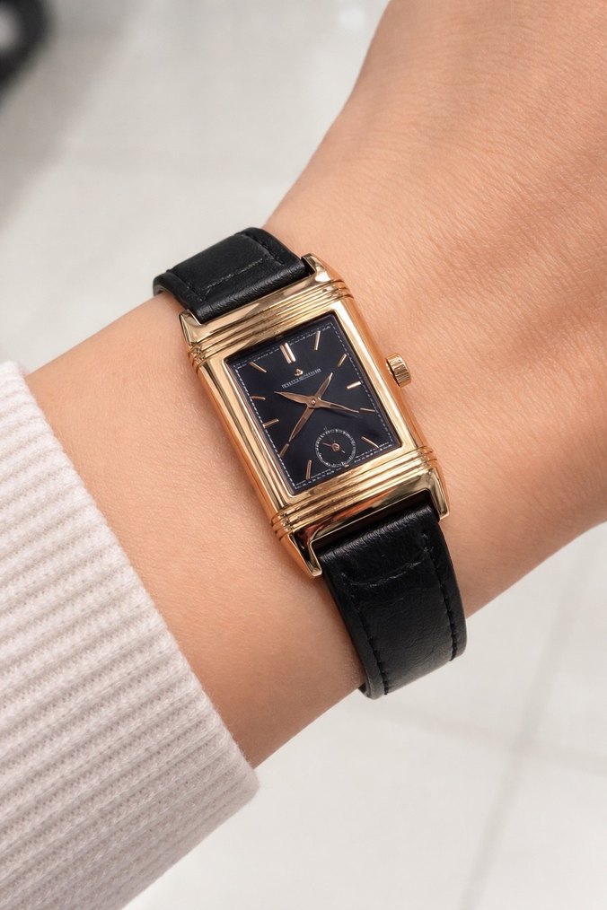 Altın renkli dikdörtgen kasa, koyu kadran ve siyah tokalı deri kayış ile modern klasik tarzda kadın saati. ⌚
