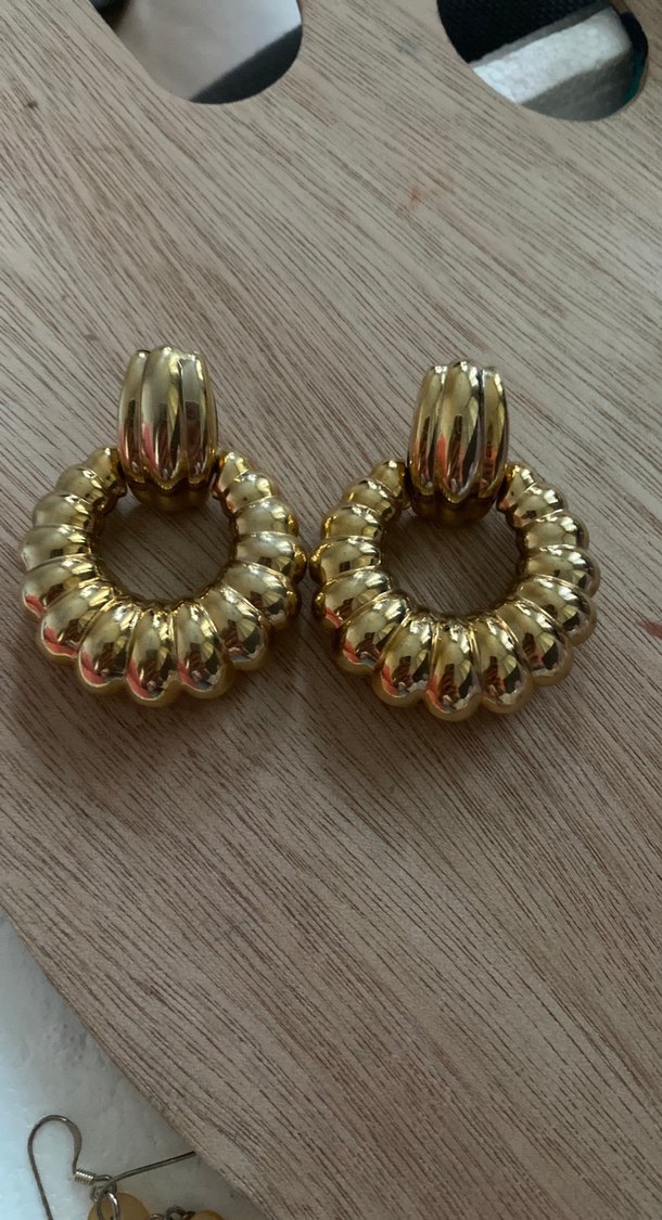 Parlak altın renkte, tokalı ve desenli modern klasik stilde midi uzunlukta küpeler. Düğün ve şık etkinlikler için uygun. ✨
