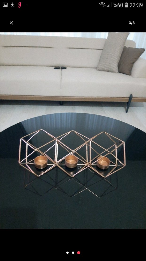 Geometrik tasarımlı, koyu altın renkli üçlü mumluk seti. Her ortama şık bir dokunuş katar. ️