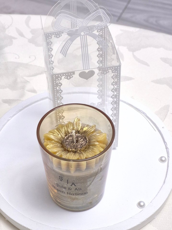 Şeffaf cam içerisinde ayçiçeği şeklinde altın renkli mum. Üzerinde kurdele ve kalp desenli şeffaf hediye kutusu ile birlikte.