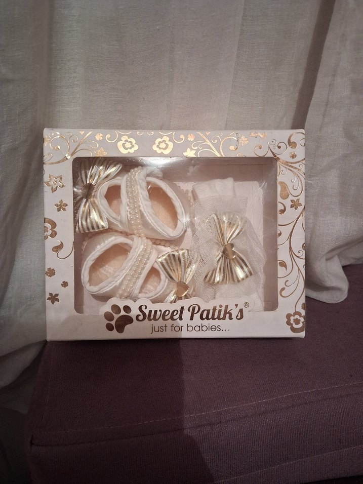 Nakışlı detaylara sahip altın renkli saten bebek ayakkabısı ve uyumlu kurdele aksesuarları, Sweet Patik's markası. Özel günler için klasik tarzda.