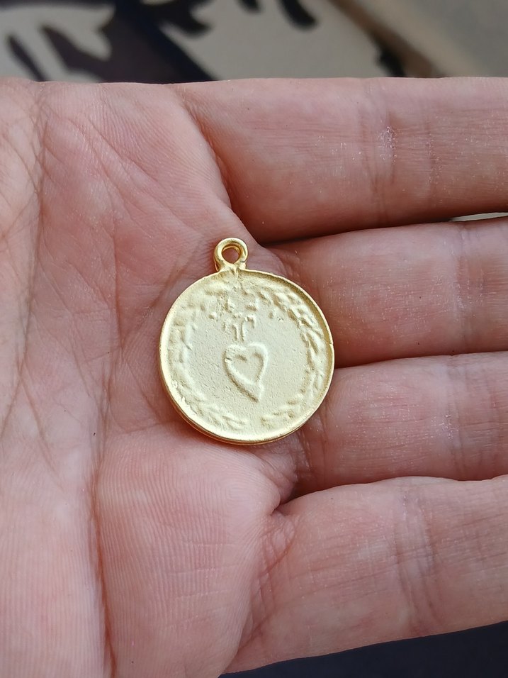 Parlak altın renkli, nakışlı kalp desenli kadın charm. Zincir detaylı, minimal, bohem ve retro tarzlara uygun, düğün için ideal.