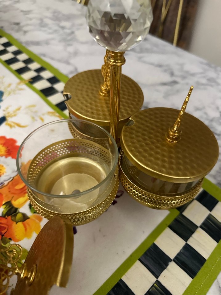 Altın renkli, nakışlı detaylara sahip geleneksel bir sofra setidir. Kapaklı cam bardak tutucusu içerir. Sofranıza klasik bir dokunuş katar. ✨