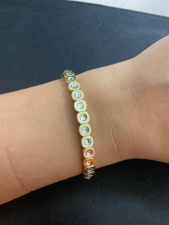 Altın renkli boncuklu ve noktalı desenli, minimalist ve bohem tarzlara uygun kadın bileklik. Günlük kullanıma uygun şık tasarım. ✨