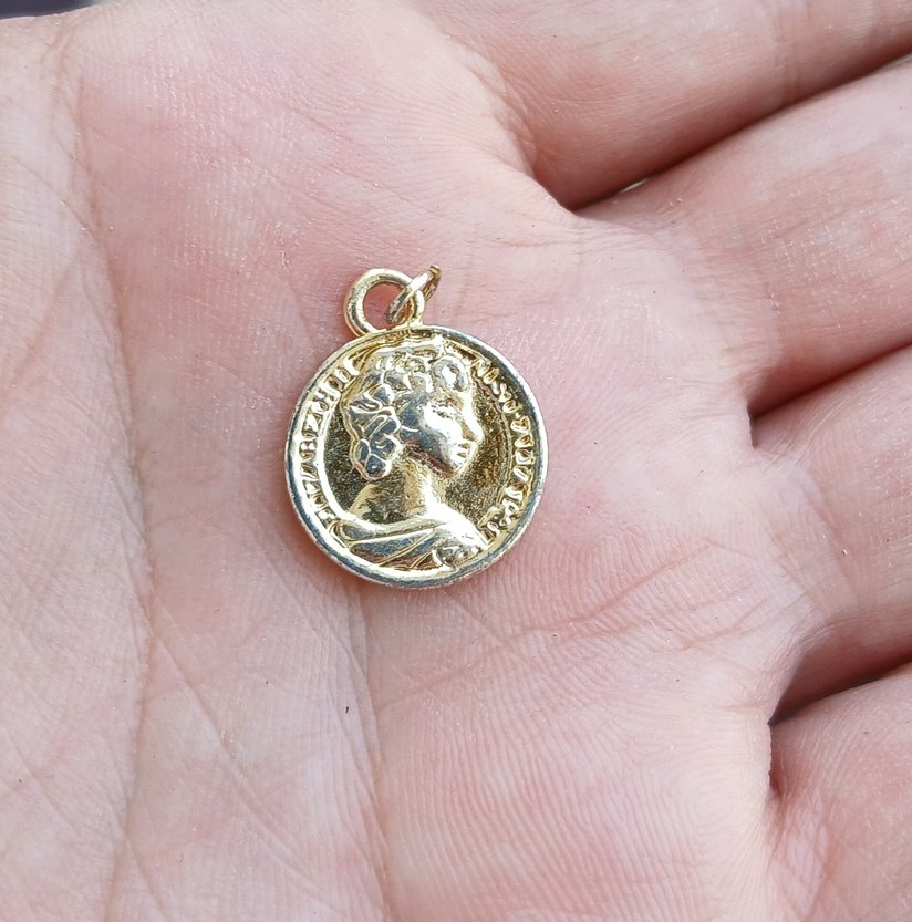 Nostaljik işlemeli, düğmeli detaylı parlak altın renkli charm kolye ucu. Günlük kullanıma uygundur. ✨