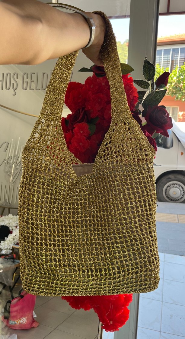 Parlak altın renkli, örgü dokulu bohem kadın çantasıdır. Günlük kullanım için yumuşak örme kumaştan yapılmıştır. Desensizdir.