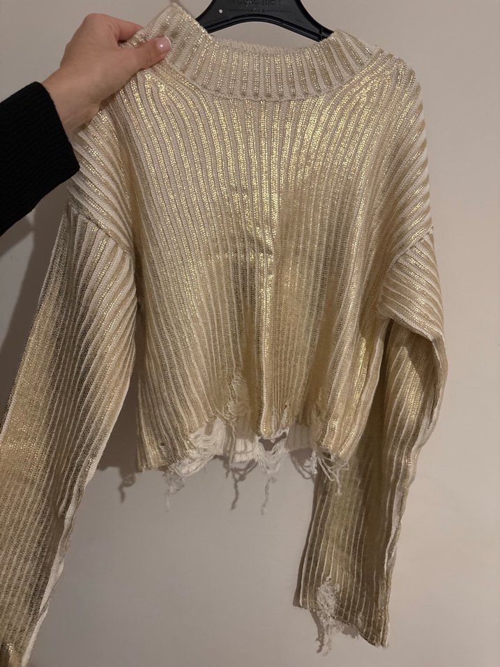 Parlak altın renkli örgü kazak, yuvarlak yakalı ve uzun kolludur. Salaş kesim