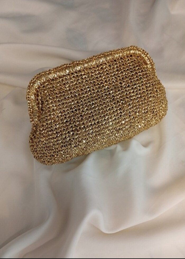 Parlak altın renkli, örgü dokulu, bohem tarzda kadın portföy çanta. Düğün ve özel günler için uygun. 18 cm yükseklik, 30 cm en. Sipariş üzerine yapılmaktadır, 1-3 iş günü içinde kargolanmaktadır.