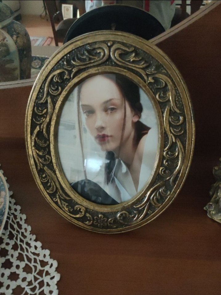 Parlak altın renkli, oval şekilli ve detaylı süslemelere sahip fotoğraf çerçevesi. ️Antika görünümlüdür Hiçbir kusuru yok.