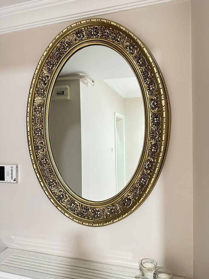 Boy 107 En 77 cm Parlak altın renkli, çiçek desenli detaylara sahip oval şekilli dekoratif ayna, mekana şıklık katıyor.