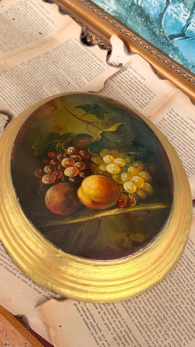 Altın renkli çerçevede, üzüm ve meyve temalı koyu arka planlı oval tablo.