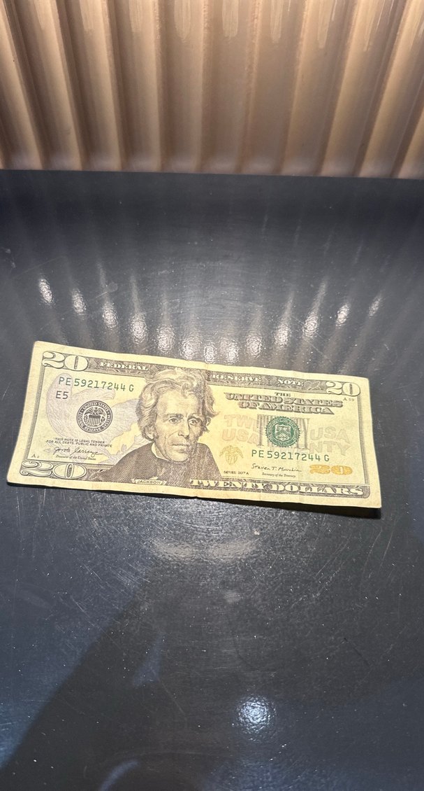 Altın renkli parlak 20 dolar banknot, PE59217244 ve PE59217244C seri numaralarına sahip. Andrew Jackson resmi ve resmi işaretler içerir.