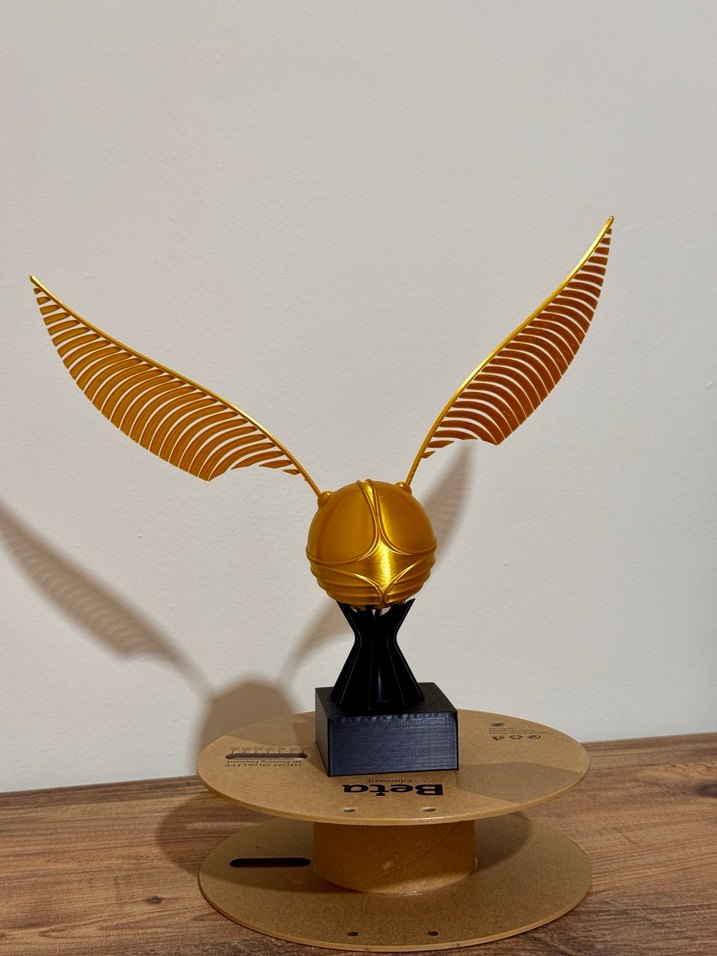 Parlak altın renkte, büyük kanat benzeri uzantılara sahip siyah tabanlı aksiyon figürü.
